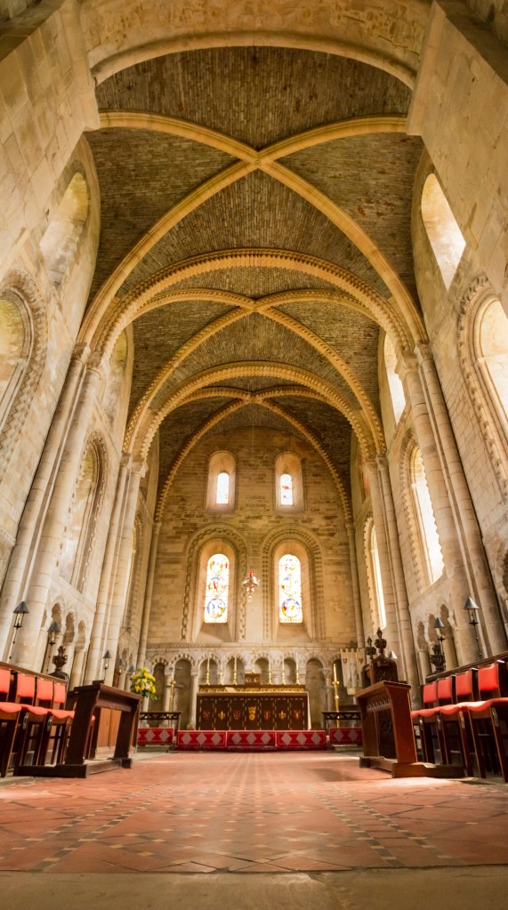 The ‘new’ Norman style windows above the altar contain Victorian stained glass of 1880-1,depicting the Annunciation (upper left), Christ the King (upper right) and (lowewindows) six roundels illustrating the Creed, from ‘Born of the Virgin Mary’ to ‘Ascended into Heaven’. High up in the walls to the north and south are small windows with Victorian glass depicting St Etheldreda and St Hugh with his pet swan. Various clues were followed and it is probable that the reconstruction was accurate.
